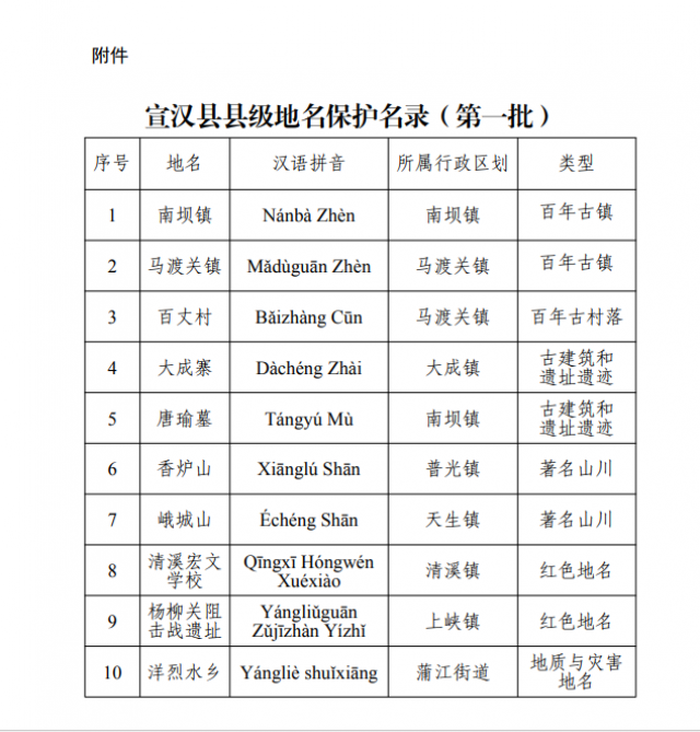 宣汉县民政局关于发布宣汉县县级地名保护名录(第一批)的公告