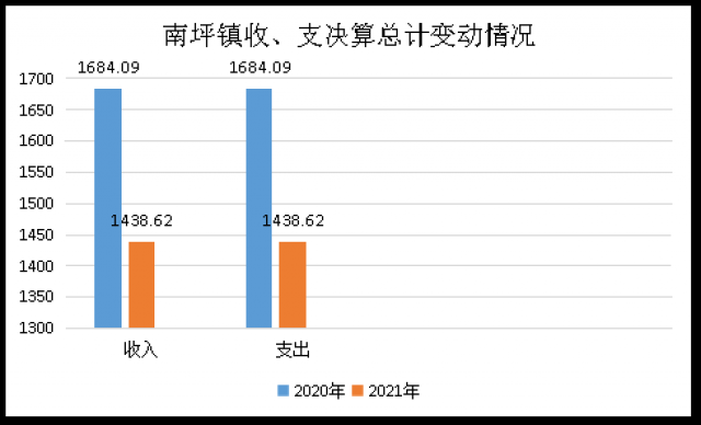 2020年度收、支总计1684.09万元。与2019年相比,收、支总计各增加275.71万元,增长19.58%。主要变动原因是2020年区划调整,南坪镇由原南坪乡、观山乡、凤林乡组建而成,南坪镇基础设施建设项目增加。