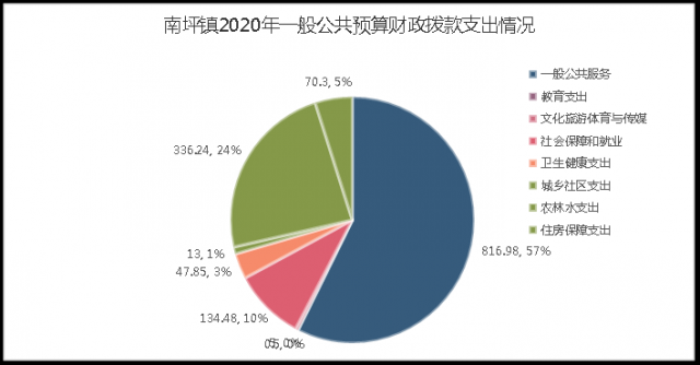 2020年财政拨款收、支总计1684.09万元。与2019年相比,财政拨款收、支总计各增加275.71万元,增长19.58%。主要变动原因是2020年区划调整,南坪镇由原南坪乡、观山乡、凤林乡组建而成,南坪镇基础设施建设项目增加。