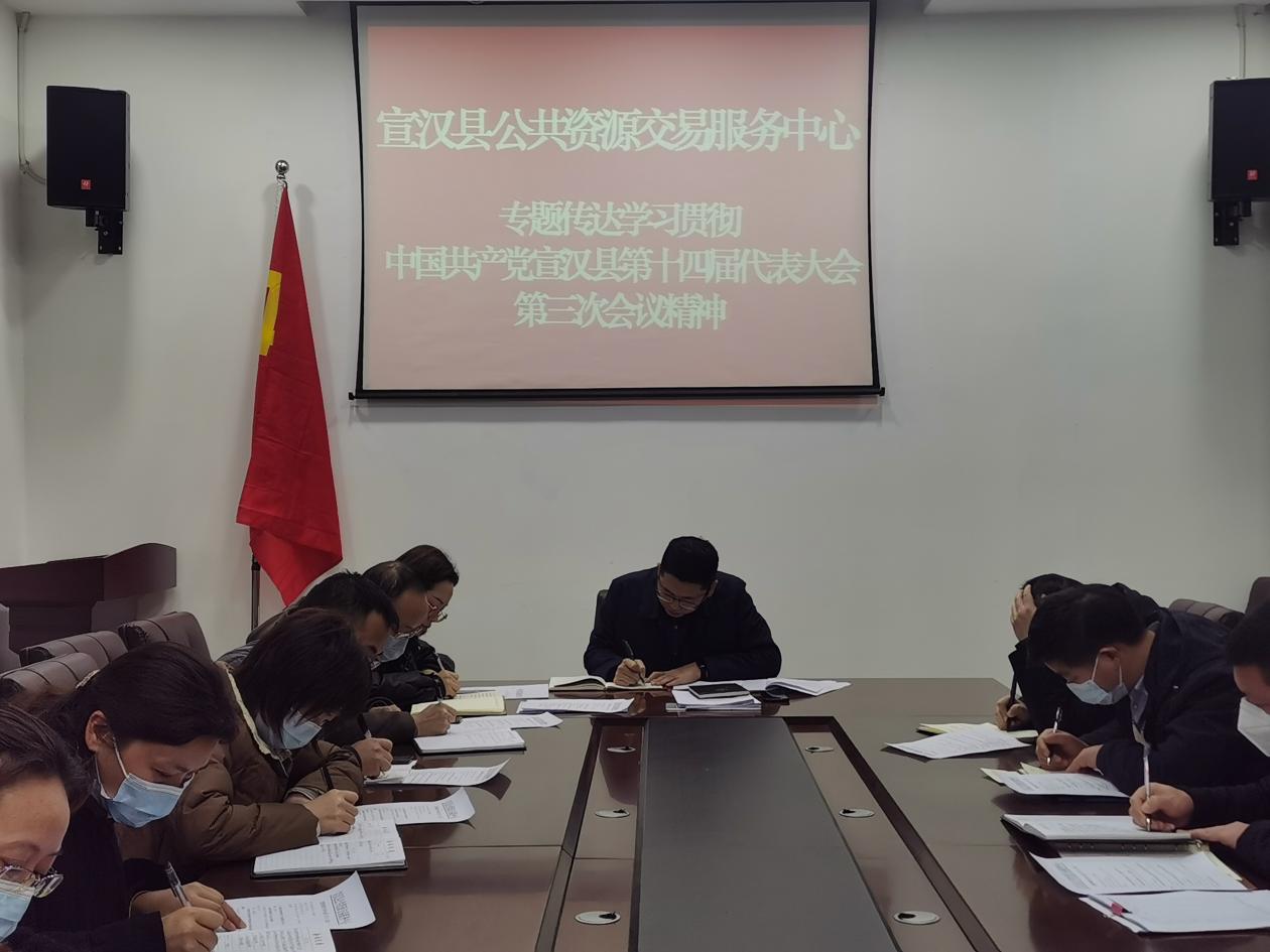 1月7日,县公共资源交易服务中心组织召开干部职工会,专题传达学习贯彻中国共产党宣汉县第十四届代表大会第三次会议精神。