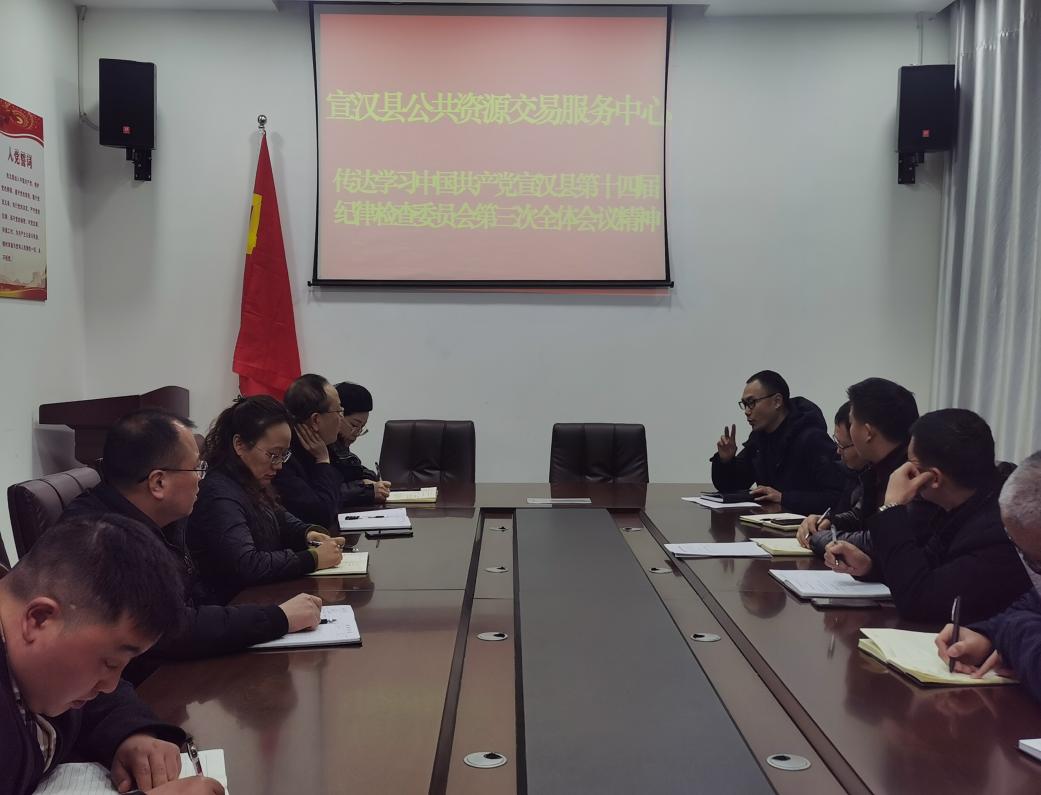 2023年2月2日下午,县公共资源交易服务中心召开干部职工会,会议认真传达学习了中共宣汉县第十四届纪律检查委员会第三次全体会议精神。中心李斌副主任主持本次工作会议,并就贯彻落实本次纪律检查委员会全体精神进行了强调。