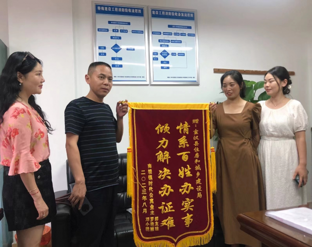 “消防手续办了,不动产登记证终于有希望了!太感谢你们了!”宣汉县南坝镇时代公寓住户拿到消防评估审批意见书,特地给县住建局送上锦旗,表达由衷的感激。