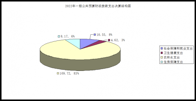 2022年一般公共预算财政拨款支出133.05万元,主要用于以下方面:社会保障和就业支出10.55万元,占7.93%;卫生健康支出4.62万元,占3.47%;农林水支出109.72万元,占82.47%;住房保障支出8.17万元,占6.14%。