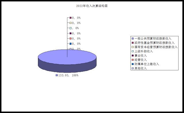 2022年本年收入合计133.05万元,其中:一般公共预算财政拨款收入133.05万元,占100%;政府性基金预算财政拨款收入0万元,占0%;国有资本经营预算财政拨款收入0万元,占0%;上级补助收入0万元,占0%;事业收入0万元,占0%;经营收入0万元,占0%;附属单位上缴收入0万元,占0%;其他收入0万元,占0%。
