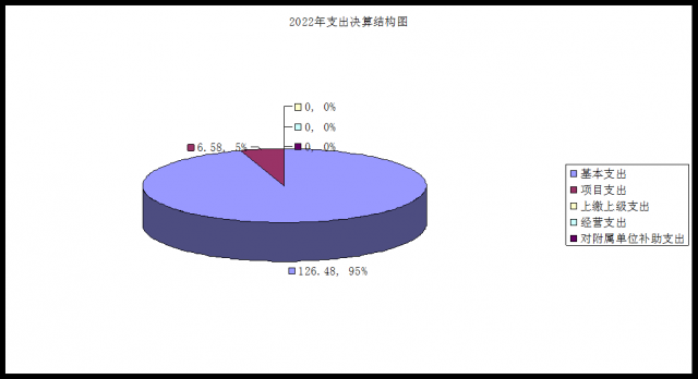 2022年本年支出合计133.05万元,其中:基本支出126.48万元,占95.06%;项目支出6.58万元,占4.94%;上缴上级支出0万元,占0%;经营支出0万元,占0%;对附属单位补助支出0万元,占0%。