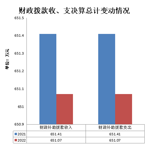 2022年度收、支总计651.07万元。与2021年相比,收、支总计各减少0.34万元,下降0.05%。主要变动原因本年度无年初结转结余资金,本单位新调入职工1人,退休1人,按有关文件规定调整了相应的工资待遇等。