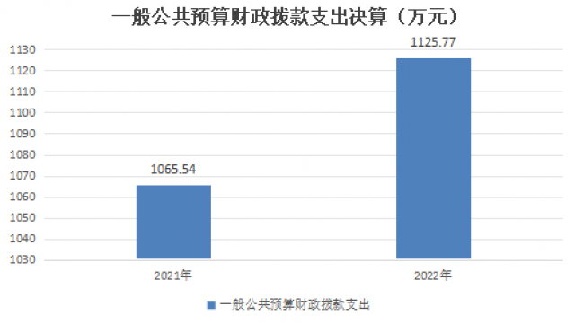2022年一般公共预算财政拨款支出1125.77万元,占本年支出合计的95.34%。与2021年相比,一般公共预算财政拨款支出增加60.23万元,增长5.35%。主要变动原因是2022年人员增加,基本支出增加。