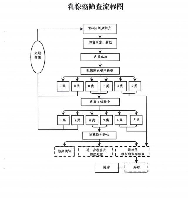 1.乳腺体检和乳腺彩超检查。对妇女进行乳腺视诊、触诊和乳腺彩超检查,乳腺彩超检查结果采用乳腺影像报告和数据系统(以下简称BI—RADS分类))进行评估。乳腺彩超检查BI—RADS分类结果为1类或2类者,原则上每2—3年筛查一次;结果为0类或3类者,进行乳腺X线检查;结果为4类或5类者,进行活检及组织病理学检查。