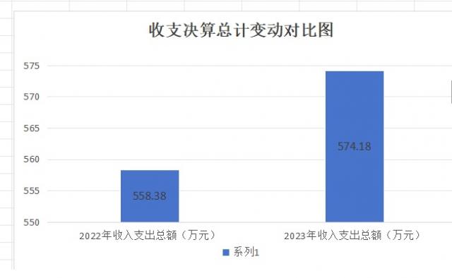2023年度收、支总计均为574.18万元。与2022年度相比,收、支总计各增加15.8万元,增长2.83%。主要变动原因是学生人数增多。