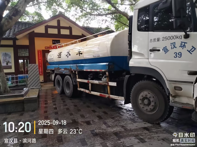 2025年9月17日清晨,宣汉县突降暴雨,滨河路一棵大型黄角树因暴雨后地基松动倒塌,导致地下主水管断裂,造成新宣中片区停水,周边居民及新宣中公厕无水可用。县住建局、园林所第一时间赶赴现场开展排危抢修,但因抢修周期较长,为保障群众舒心入厕需求,县环卫所迅速响应,启动应急预案,调配洒水车为公厕提供临时用水。