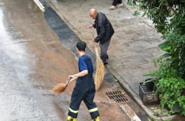 沿线群众也自发加入清淤队伍,纷纷拿起扫帚、铁锹等工具,配合消防车进行路面清洗。干群齐心协力,现场忙碌有序,场镇道路焕然一新。