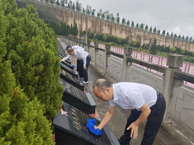 烈士墓前,党员干部神情庄重,仔细阅读了解墓碑镌刻的烈士生平事迹,手持毛巾仔细擦拭烈士墓碑上的水渍,清理墓区杂物,以指尖传递对革命先烈的深切哀悼。