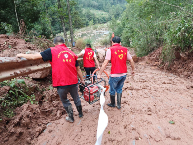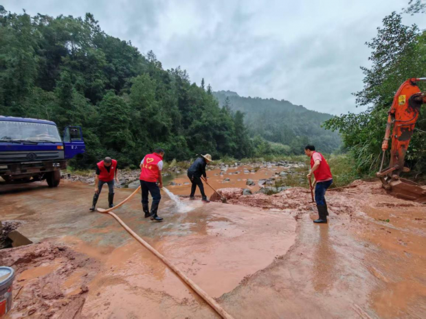 清淤现场情况复杂,淤泥深厚,作业面狭窄,党员干部们充分发挥先锋模范作用,毫不退缩,科学分工,密切配合,形成了高效有序的抢险流水线。部分干部操作小型抽水泵,利用高压水枪冲刷、稀释厚重淤泥,其他志愿者则手持铁锹,紧随其后清理残留碎石与泥浆,协调调配的挖掘机在后方持续作业,清理较大体积的垮塌物,在大家近4个小时的协作配合下,百余米道路淤泥被清理干净。