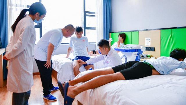 科学评估先行,个性化方案精准施策。在理疗过程中,康复科医务人员对每位球员的身体机能进行了系统评估,涵盖肌肉力量、关节活动度及身体柔韧性等关键指标。基于评估结果,团队为球员们量身打造了个性化的理疗方案,确保了干预措施的针对性和有效性,实现了“一人一策”的精准康复干预。