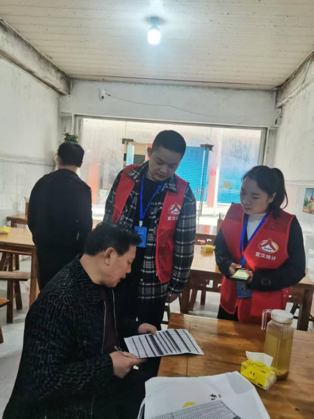 画面中,红峰镇乡村振兴办专职干部同社区工作者一同身着印有“宣汉统计”字样和党徽的红色马甲,正与社区居民进行交流,他们手持电子采集设备,专注地进行信息录入,细致核对桌上的文件内容,确保信息的准确性。被抽查到的居民正低头在一份带有识别码的文件上签字确认,整个流程严谨、规范。
