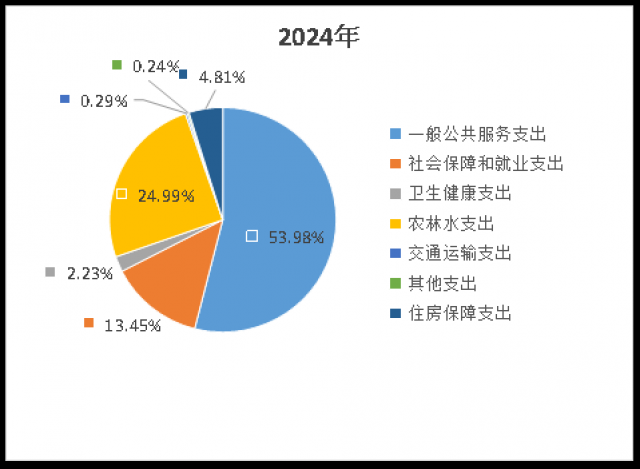 2024年一般公共预算财政拨款支出2046.56万元,主要用于以下方面:一般公共服务支出1104.81万元,占53.98%;社会保障和就业支出275.18万元,占13.45%;卫生健康支出45.59万元,占2.23%;农林水支出511.47万元,占24.99%;交通运输支出6万元,占0.29%;住房保障支出98.51万元,占4.81%;其他支出5万元,占0.24%。