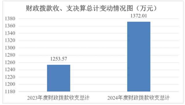 2024年度财政拨款收入、支出总计均为1372.01万元。与2023年度相比,财政拨款收入总计、支出总计各增加118.44万元,增长9.44%。主要变动原因是人员工资增加。