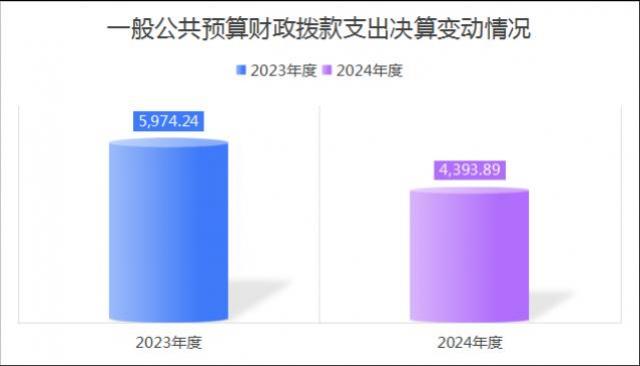 2024年度一般公共预算财政拨款支出4,393.89万元,占本年支出合计的73.4%。与2023年度相比,一般公共预算财政拨款支出减少1,580.35万元,下降26.5%。主要变动原因是人员变化预算调整及年终基建投资预算调整等。