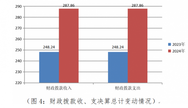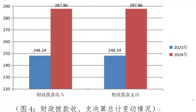2024年度财政拨款收入、支出总计均为287.86万元。与2023年度相比,财政拨款收入总计、支出总计各增加39.62万元,上升15.9%。主要变动原因是2024年度单位人员增加。
