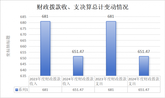 2024年度财政拨款收入、支出总计均为651.47万元。与2023年度相比,财政拨款收入总计、支出总计各增加/减少29.53万元,下降4.33%。主要变动原因是教师人员减少,工资减少。