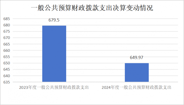 2024年度一般公共预算财政拨款支出649.97万元,占本年支出合计的99.77%。与2023年度相比,一般公共预算财政拨款支出增加/减少29.53万元,下降4.35%。主要变动原因是教师人员减少,工资减少。