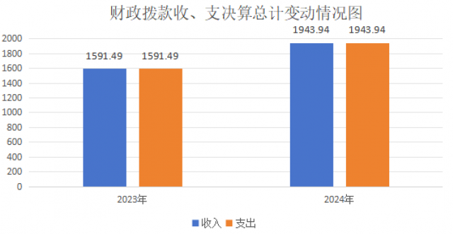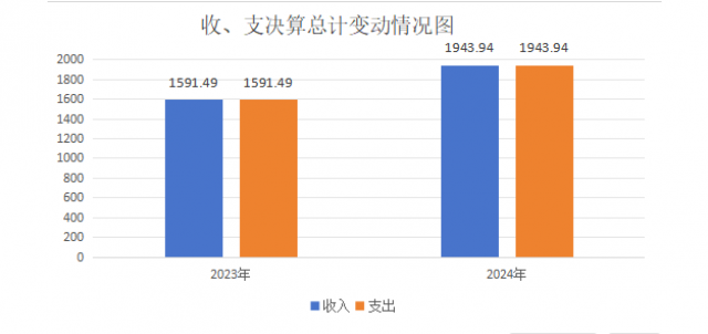 2024年度收、支总计均为1943.94万元。与2023年度相比,收、支总计各增加352.45万元,上升22.15%。主要变动原因是教育资金投入增加。