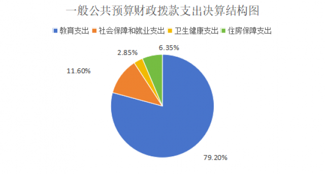 2024年度一般公共预算财政拨款支出1917万元,主要用于以下方面:教育支出1518.36万元,占79.20%;社会保障和就业支出222.39万元,占11.60%;卫生健康支出54.62万元,占2.85%;住房保障支出121.64万元,占6.35%。