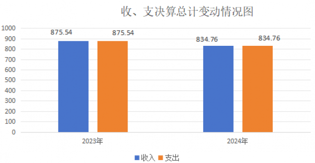 2024年度收、支总计均为834.76万元。与2023年度相比,收、支总计各减少40.78万元,下降4.66%。主要变动原因是教育资金支出减少。
