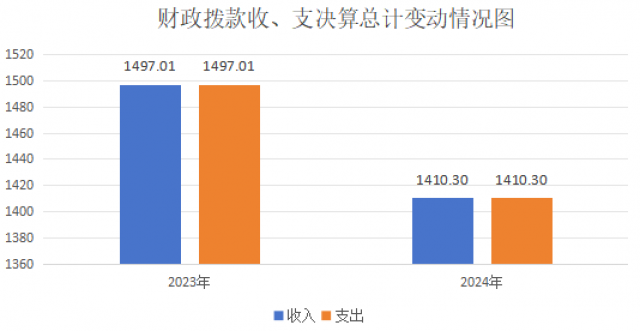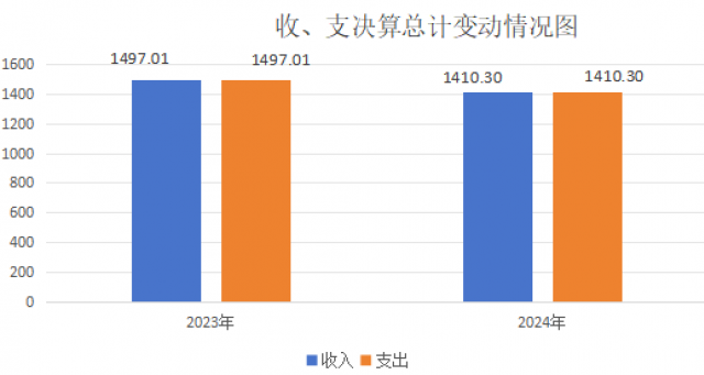 2024年度收、支总计均为1410.3万元。与2023年度相比,收、支总计各减少86.71万元,降低5.79%。主要变动原因是学生人数减少导致的生均经费减少。