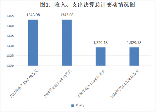 2024年度收、支总计均为1329.18 万元。与2023年度相比,收、支总计各减少13.9万元,下降1.03%。主要变动原因是人员减少经费减少。