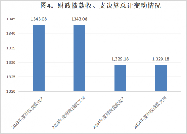 2024年度财政拨款收入、支出总计均为1329.18万元。与2023年度相比,财政拨款收入总计、支出总计各减少13.9万元,下降1.03%。主要变动原因是人员减少经费减少。