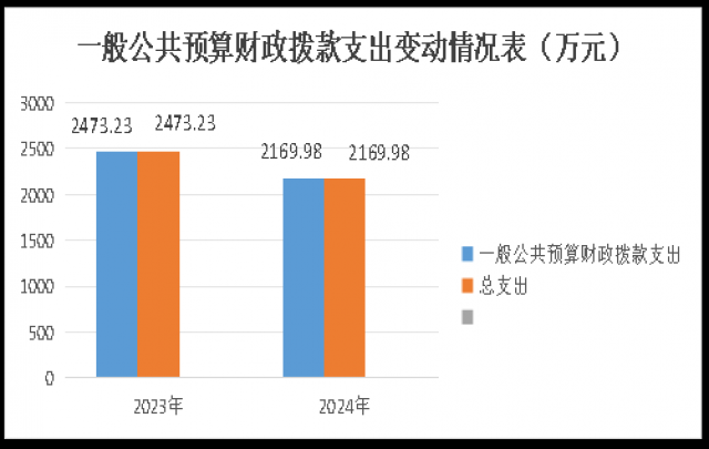 2024年一般公共预算财政拨款支出2169.98万元,占本年支出合计的99.6%。与2023年相比,一般公共预算财政拨款支出减少303.25万元,下降14%。主要变动原因是项目减少、人员退休和调出。