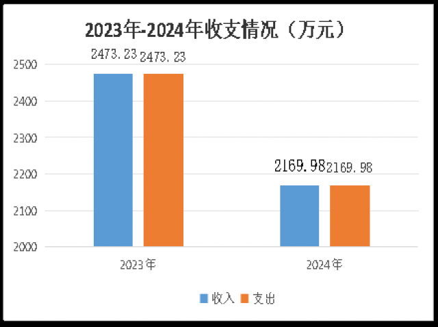 2024年度收、支总计2169.98万元。与2023年相比,收、支总计各减少303.25万元,下降14%。主要变动原因是项目减少、人员退休调出。