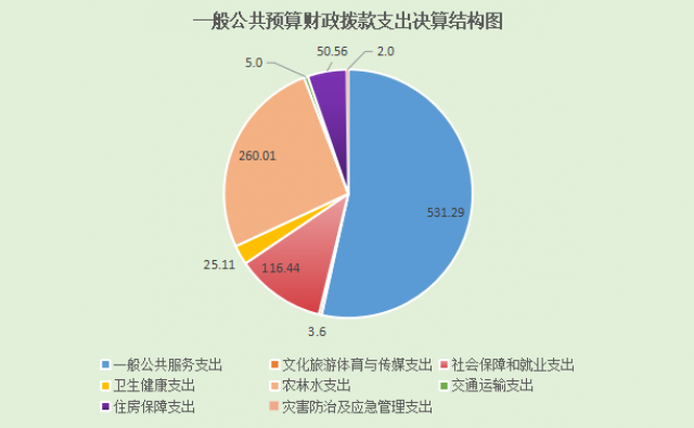 2024年度一般公共预算财政拨款支出994.03万元,主要用于以下方面:一般公共服务支出531.29万元,占53.4%;文化旅游体育与传媒支出3.6万元,占0.4%;社会保障和就业支出116.44万元,占11.7%;卫生健康支出25.11万元,占2.6%;农林水支出260.01万元,占26.1%;交通运输支出5万元,占0.5%;住房保障支出50.56万元,占5.1%;灾害防治及应急管理支出2万元,占0.2%。