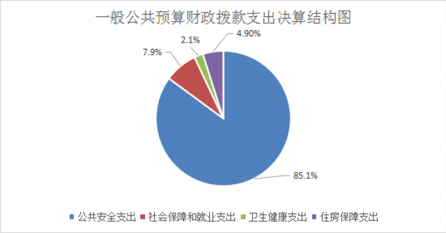 2024年度一般公共预算财政拨款支出16104.74万元,主要用于以下方面:公共安全支出13710.9万元,占85.1%;社会保障和就业支出1272.47万元,占7.9%;卫生健康支出335.54万元,占2.1%;住房保障支出785.82万元,占4.9%。