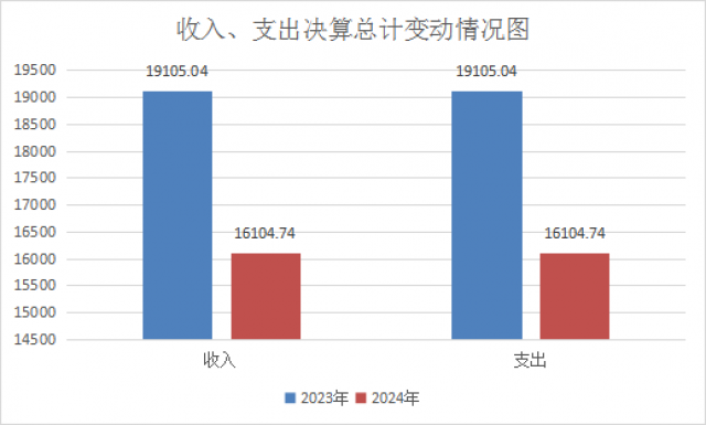 2024年度收入、支出总计均为16104.74万元。与2023年度相比,收入、支出总计各减少3000.3万元,下降15.7%。主要变动原因是厉行节约。