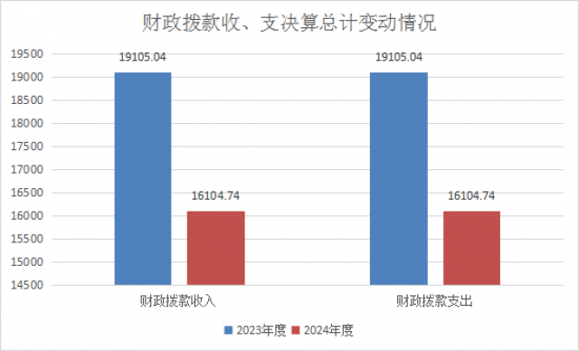 2024年度财政拨款收入、支出总计均为16104.74万元。与2023年度相比,财政拨款收入总计、支出总计各减少3000.3万元,下降15.7%。主要变动原因是厉行节约。