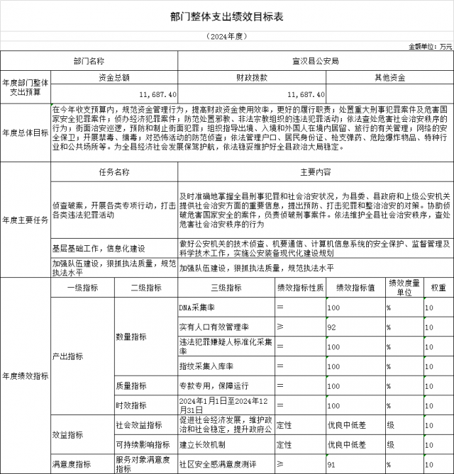 宣汉县公安局部门结合部门职责职能,设定工作目标,根据工作目标预算部门经费。2024年年初预算11687.40万元,严格按照预算管理制度编制、申报、管理预算资金,实行收支两条线管理,做到预算管理公开化,各类案事件推动有力,按阶段及案情保障到位,使社会治安大局趋于稳定,人民群众安全感进一步上升,有力保障了社会经济的发展。经过认真对照《部门预算绩效评价指标体系》,我局各项指标都较好达到了相关要求,自评分为93分。