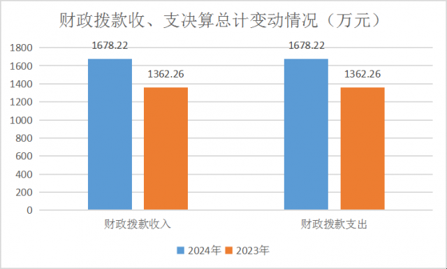 2024年度财政拨款收入、支出总计均为1678.22万元。与2023年度相比,财政拨款收入总计、支出总计各增加315.96万元,增长23.19%。主要变动原因是一般公共服务的支出的增加。