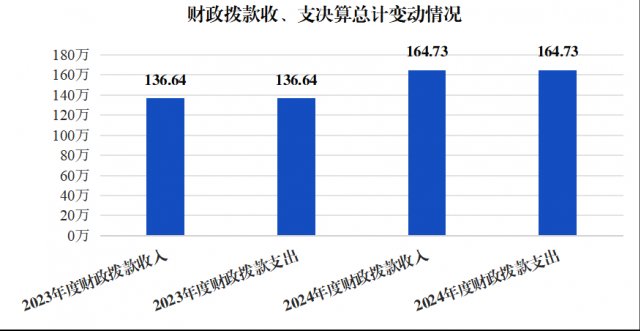 2024年度财政拨款收入、支出总计均为164.73万元。与2023年度相比,财政拨款收入总计、支出总计各增加28.09万元,增长20.6%。主要变动原因是人员增多以及正常调资。
