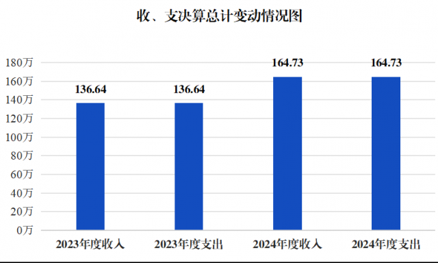 2024年度收入、支出总计均为164.73万元。与2023年度相比,收入、支出总计各增加28.09万元,增长20.6%。主要变动原因是人员增多以及正常调资。