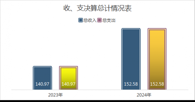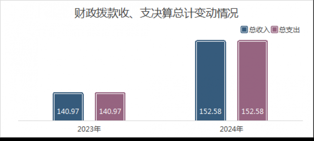 2024年度收、支总计均为152.58万元。与2023年度相比,收、支总计各增加11.61万元,增长8.2%。主要变动原因是2024年人员工资调整,支出增加。