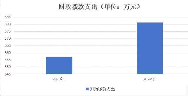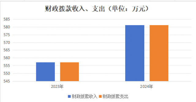 2024年度财政拨款收入、支出总计均为581.27万元。与2023年度相比,财政拨款收入总计、支出总计各增加24.09万元,增长4.3%。主要变动原因是人员经费增加。
