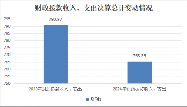 2024年财政拨款收、支总计765.35万元。与2023年相比,财政拨款收、支总计各减少25.62万元,减少3.35%。主要变动原因是教师、学生减少,导致人员经费减少。