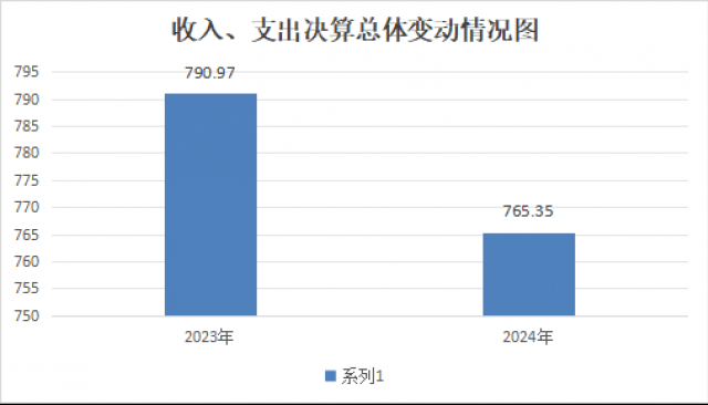 2024年度收、支总计765.35万元。与2023年相比,收、支总计各减少25.62万元,减3.35%。主要变动原因是教师、学生减少,导致人员经费减少。