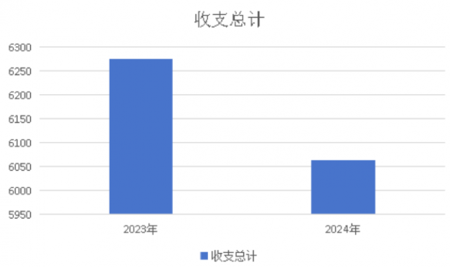 2024年度收、支总计均为6063.08万元。与2023年度相比,收、支总计各减少212.39万元,减少3.38%。主要变动原因是环卫车辆租赁费及路灯设施安装费支出减少。