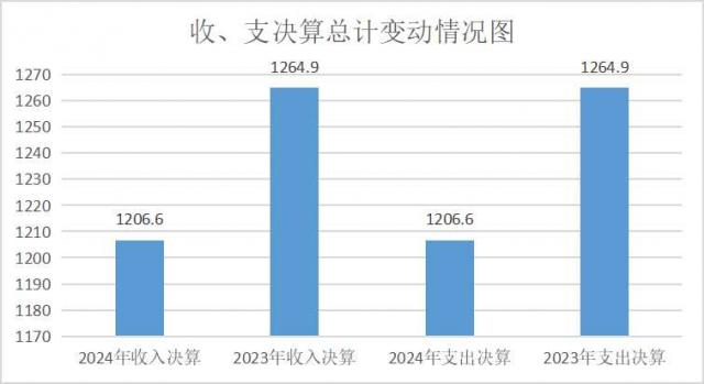 2024年度收、支总计均为1206.6万元。与2023年度相比,收、支总计各减少58.29万元下降4.61%。主要变动原因是教师人员减少,工资减少。