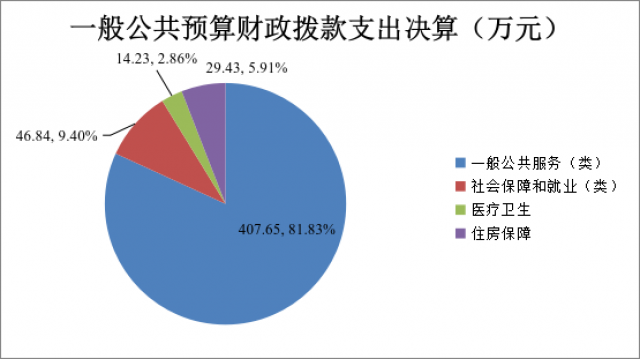 2024年一般公共预算财政拨款支出498.15万元,主要用于以下方面:一般公共服务支出407.65万元,占81.83%;教育支出0万元,占0%;科学技术支出0万元,占0%;文化旅游体育与传媒支出0万元,占0%;社会保障和就业支出46.84万元,占9.4%;卫生健康支出14.23万元,占2.86%;住房保障支出29.43万元,占5.91%。