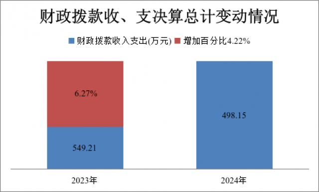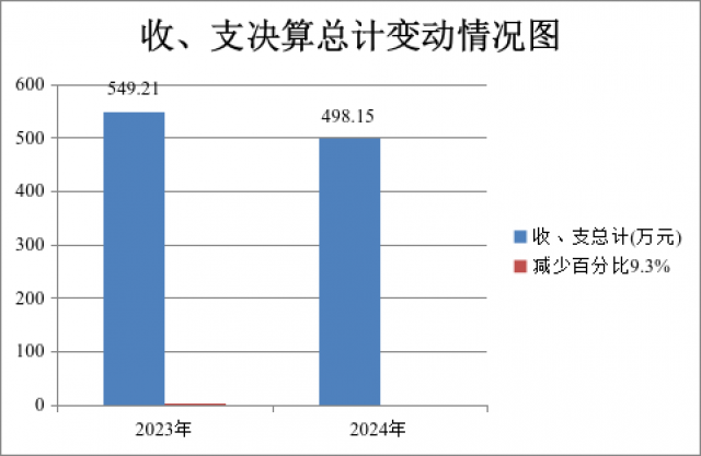 2024年度收、支总计498.15万元。与2023年相比,收、支总计减少51.06万元,减少9.3%。主要变动原因预算、项目经费减少。