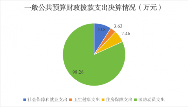 2024年度一般公共预算财政拨款支出120.15万元,主要用于以下方面: 社会保障和就业支出10.8万元,占9%,卫生健康支出3.63万元,占3%;住房保障支出7.46万元,占6.2%,国防动员支出98.26万元,占81.8%。